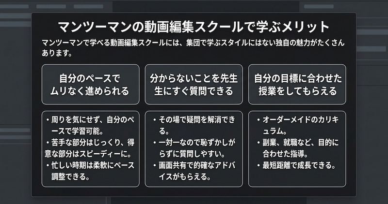 マンツーマンで学べる動画編集スクールには、集団で学ぶスタイルにはない独自の魅力がたくさんあります。