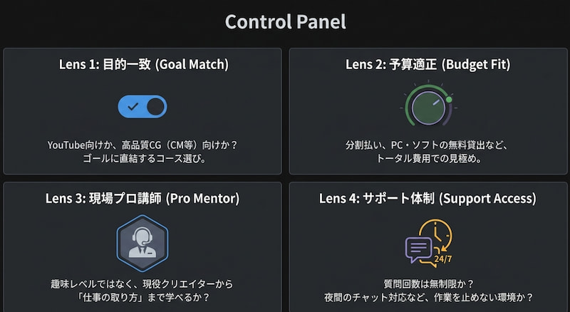 たとえば、YouTubeの動画を作りたい人が、映画のような高度なCGを学ぶコースを選んでしまうと、時間もお金も無駄になってしまいます。