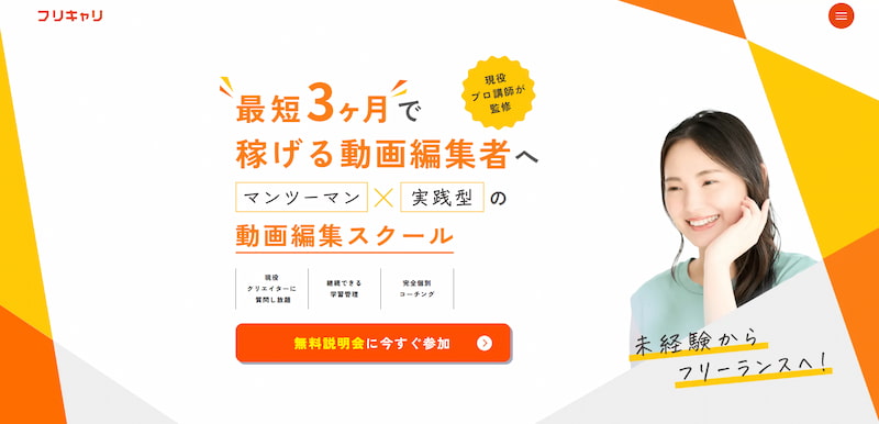フリキャリは、「マンツーマン × 実践型」をコンセプトに掲げる完全オンラインの動画編集スクールです。