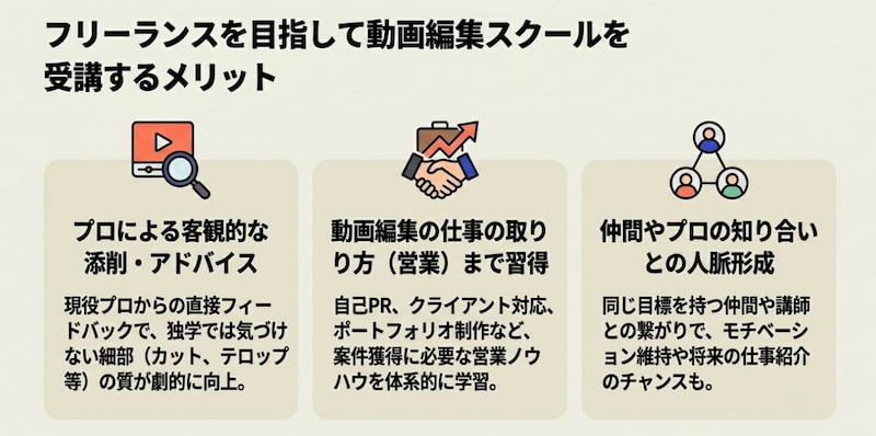 ここでは、フリーランスを目指すうえでスクールを受講するメリットを3つ解説します。