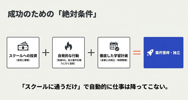 スクールは仕事の取り方やスキルを教えてくれる場所ですが、代わりに行動してくれるわけではありません。