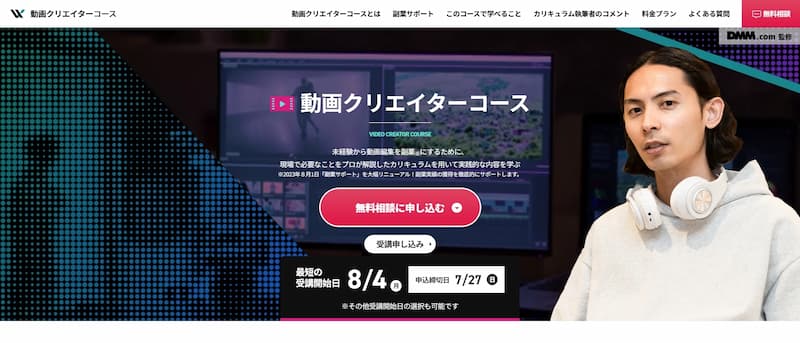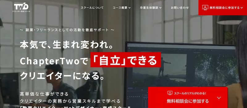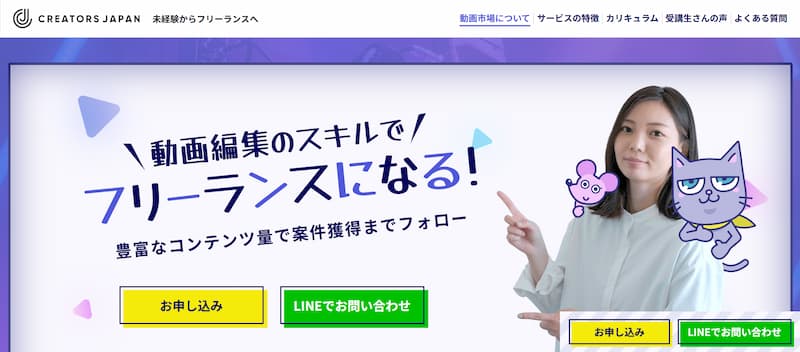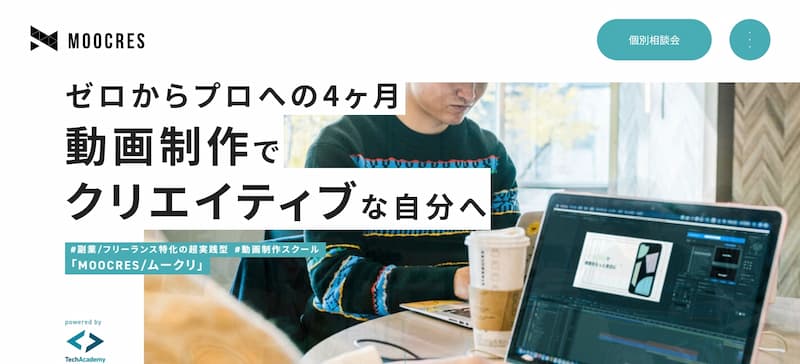 最短3ヶ月で未経験からプロの動画クリエイターを目指せる充実したカリキュラムが特徴で、現役フリーランスによるマンツーマンサポートを受けながら学習できます。実案件データをもとに作成されたカリキュラムで、卒業後すぐに活用できる実践的なスキルが身につきます。
