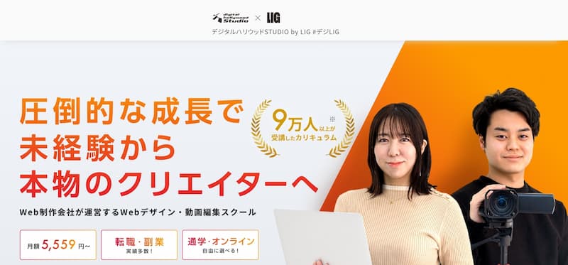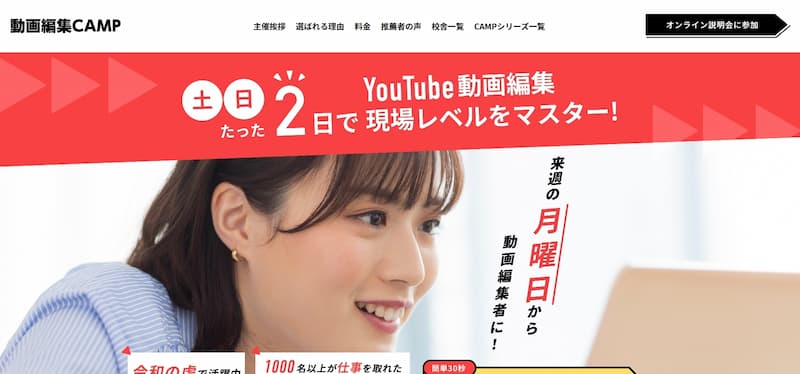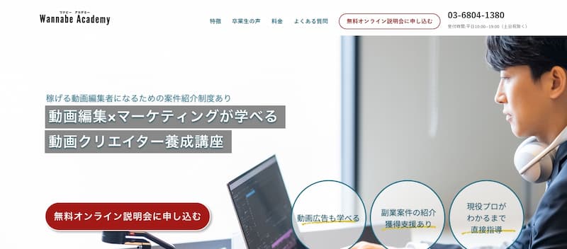 編集技術だけでなく、サムネイル制作やディレクションスキルも習得でき、副業から独立まで幅広く対応。コストパフォーマンス重視で動画編集を始めたい社会人におすすめです。