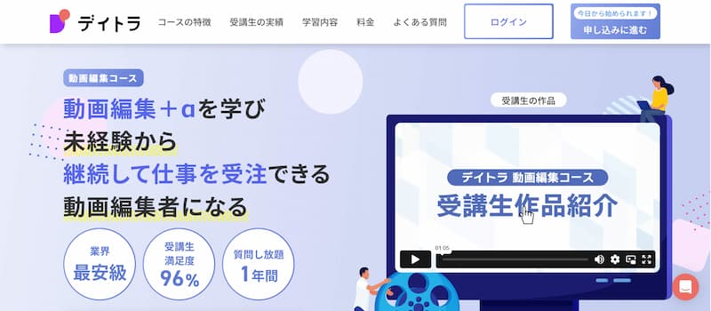 24時間いつでも自分のペースで学習でき、チャットサポートも永久利用可能なため、働きながらスキルアップを目指す社会人に最適です。業界最安級の料金でありながら、映像制作プロダクションとしての豊富な案件紹介もあり、副業・フリーランスとして収入を得ながら成長できる動画編集スクールです。