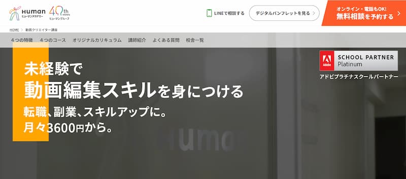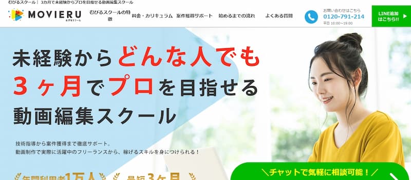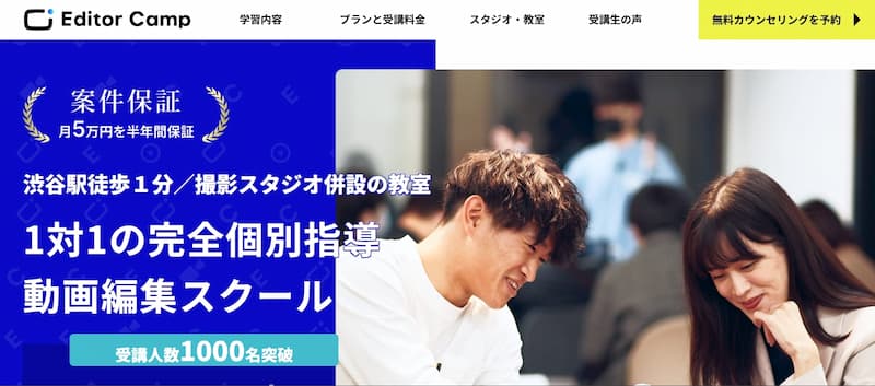 最大の強みは卒業後の案件紹介サポートで、専属コンシェルジュが商談に同席し、制作まで講師が徹底フォローします。業界最安級の月額4,583円から受講可能で、働きながらでも無理なく動画編集スキルを習得し、副業・フリーランスとして確実に収入を得られる社会人におすすめのスクールです。