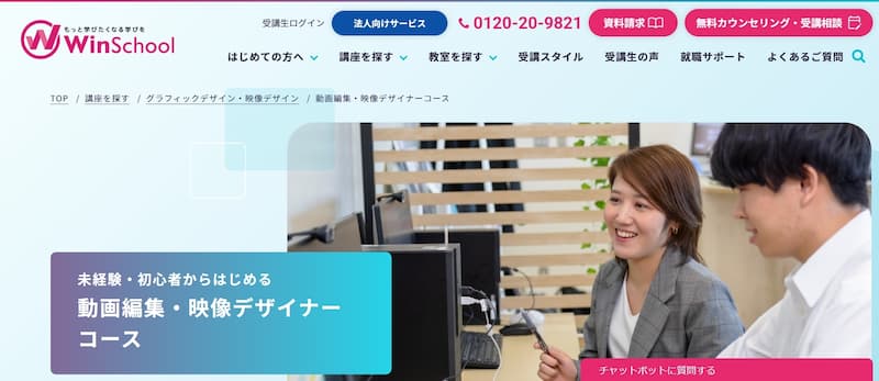 Winスクールは全国約50教室を展開する実績豊富なパソコンスクールです。動画編集コースでは業界標準のPremiere ProとAfter Effectsを基礎から学べ、個別指導による丁寧なサポートが特徴です。