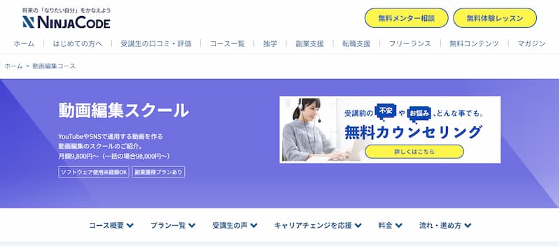 忍者CODEは業界最安クラス98,000円から動画編集を学べるオンラインスクールです。買い切り型で受講期間無期限、現役クリエイターによる無期限チャットサポートが特徴で、忙しい社会人でも自分のペースで学習を進められます。