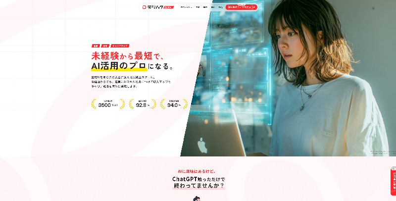 ChatGPTやプロンプトエンジニアリング、プログラミングまで幅広く学習でき、コードが書けない方でも最速でAI活用人材を目指せます。45,000人の指導実績から生まれたオリジナルカリキュラムと、24時間利用可能なQ&A掲示板による充実したサポート体制が特徴です。
