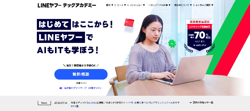 LINEヤフーテックアカデミーは、Yahoo! JAPANやLINEを運営するLINEヤフーと、実績豊富なプログラミングスクール「テックアカデミー」が合同で設立した生成AI副業AIスクールです。