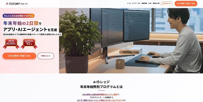 | 受講料金 | コースにより異なる ChatGPTの基礎・応用コース:2週間〜 データ活用基礎コース:2週間〜 はじめてのWebアプリ開発コース:8週間/12週間 エンジニア転職保証コース:16週間 |