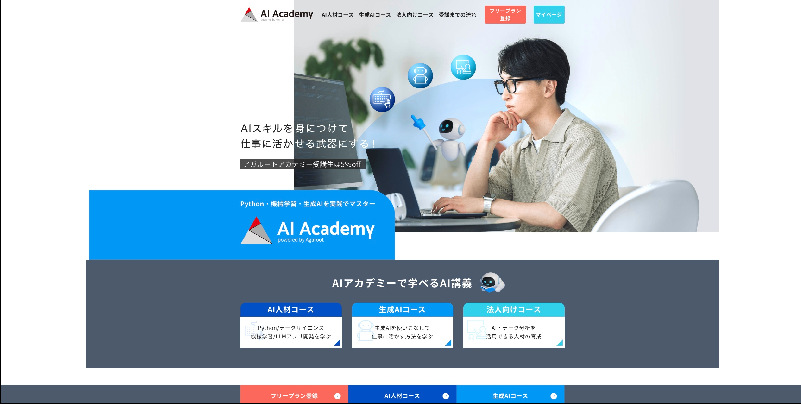 AI Academyは、500種類以上のオリジナル教材を通じて生成AIを体系的にマスターできるオンラインスクールです。プロンプトの書き方から業務効率化の実践テクニックまで、初心者でも段階的にスキルを習得できるカリキュラムが用意されています。