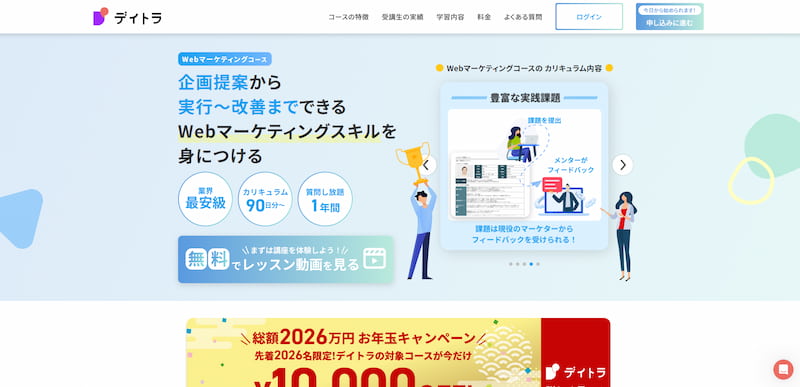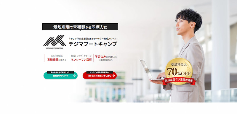DMM.comグループが運営し、未経験から最短3ヶ月でWebマーケターへの転職を目指せる転職コース、実践的なスキルを身につける学習コース、副業から始めたい方向けの副業コースを提供しています。