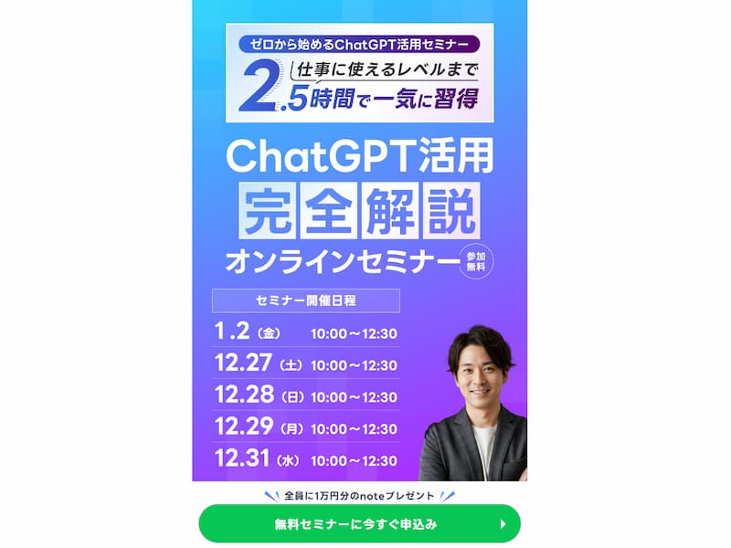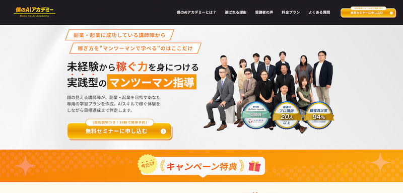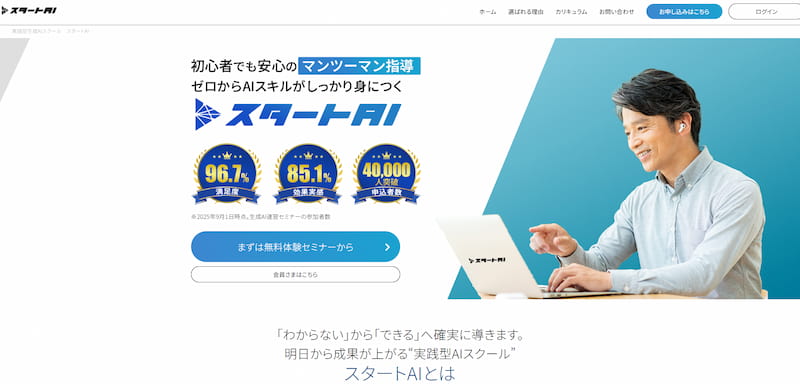 | 料金(税込) | 生成AI基礎実践コース:198,000円 生成AIマーケティング実践コース:298,000円 生成AI営業実践コース:298,000円 生成AI業務自動化コース:498,000円 生成AI×WEB副業コース:638,000円 ※経済産業省リスキリング補助金により最大70%OFF |