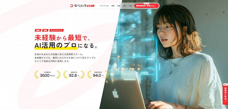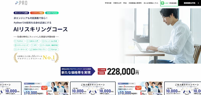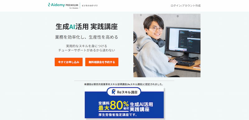 | 料金 | 生成AI入門:148,500円~247,500円 生成AIエンジニア:275,000円~429,000円 ※経済産業省リスキリング補助金により最大70%OFF |