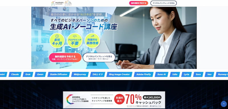 ヒューマンアカデミーの生成AI講座は、AIテクノロジー企業レッジと教育のプロが共同開発した、ビジネスパーソン向けのノーコードAI活用講座です。