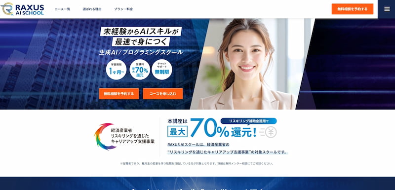 RAXUS AIスクールは、目的別に選べる8つのAI活用コースを提供するオンラインスクールです。