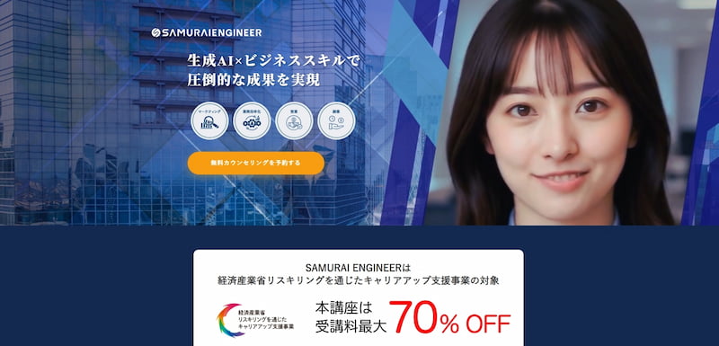 Samurai Engineerの生成AIコースは、現役エンジニアによる専属マンツーマン指導が特徴のAI学習プログラムです。