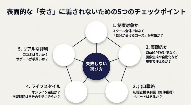 生成AIスクールは数が多く、見た目の価格や知名度だけでは本当に自分に合うか判断しにくいです。