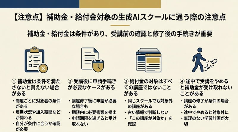 以降では、補助金・給付金対象の生成AIスクールに通う際の注意点について紹介します。