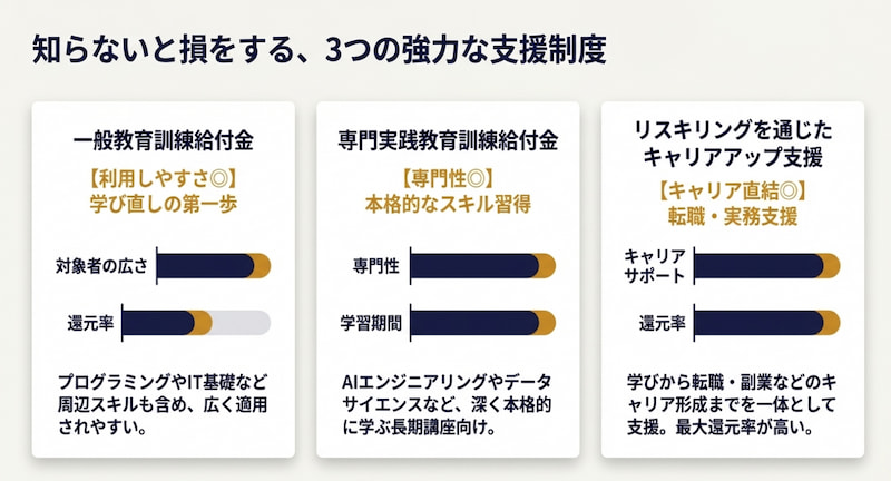 この記事では、生成AIスクールで使える主な補助金・給付金の種類やスクール選びのポイントについてわかりやすく解説します。