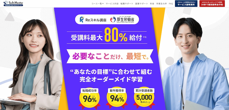 Tech Mentor(テックメンター)は、厚生労働省の専門実践教育訓練給付金(最大80%給付)に対応した生成AIスクールで、生成AIエンジニアコースやバイブコーディング(AI駆動開発)コース、生成AI活用コースなど複数のAI関連講座を用意しています。