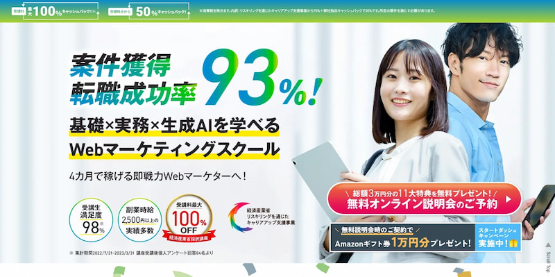 現役Webマーケター講師による無制限のチャットサポートや国家資格保有のキャリアコンサルタントによる転職支援も充実しており、学習から就職まで一貫してサポートしています。